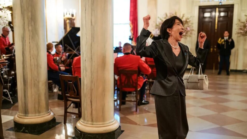 На фотографији коју је објавила Бела кућа види се Такаичи са подигнутим рукама и широко отвореним устима, како „на нешто“ емотивно реагује.